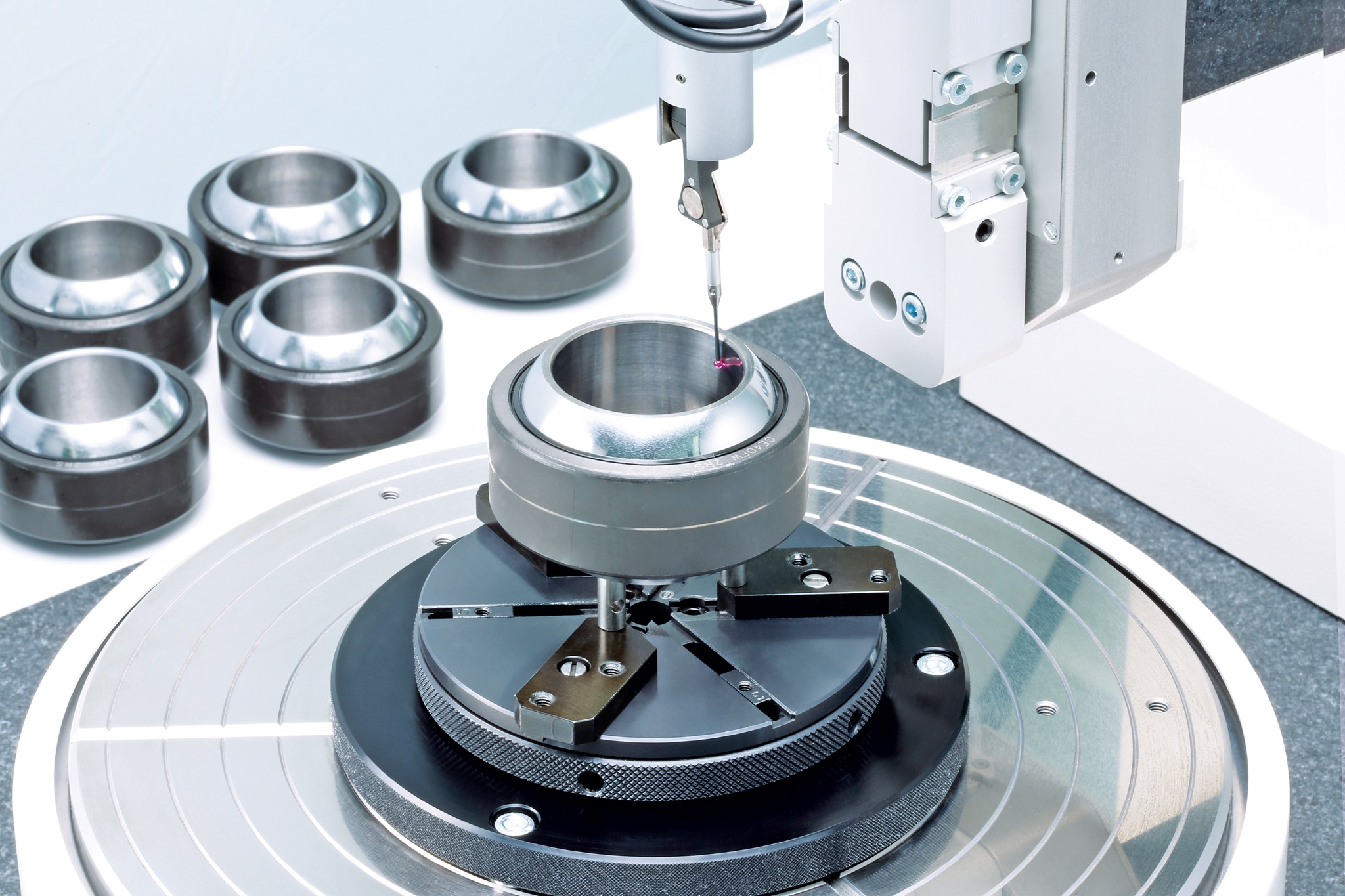 Mehrere JENOPTIC Hommel Etamic F 435 Messplätze verfügen über einen luftgelagerten Drehtisch. Sie bieten eine vollautomatische Werkstückausrichtung und minimale Messzeiten bei maximalem Bedienkomfort. Die für Wälzlager wichtigen Form- und Lagertoleranzen werden über präzise in Radial- und Axialrichtung geführten Messachsen überprüft.